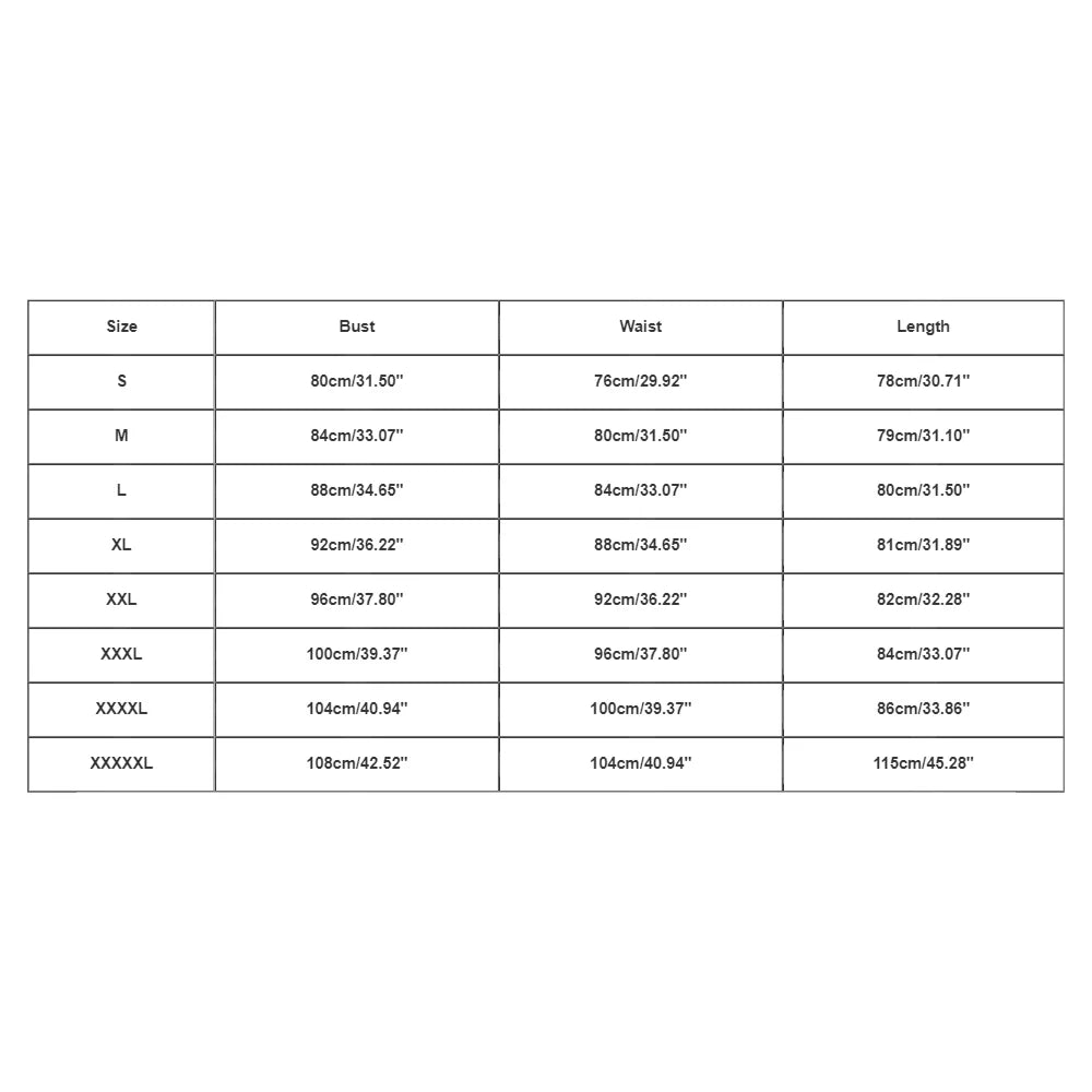 | Size:XXXL | Bust:100cm/39.37'' | Waist:96cm/37.80'' | Length:84cm/33.07'' |