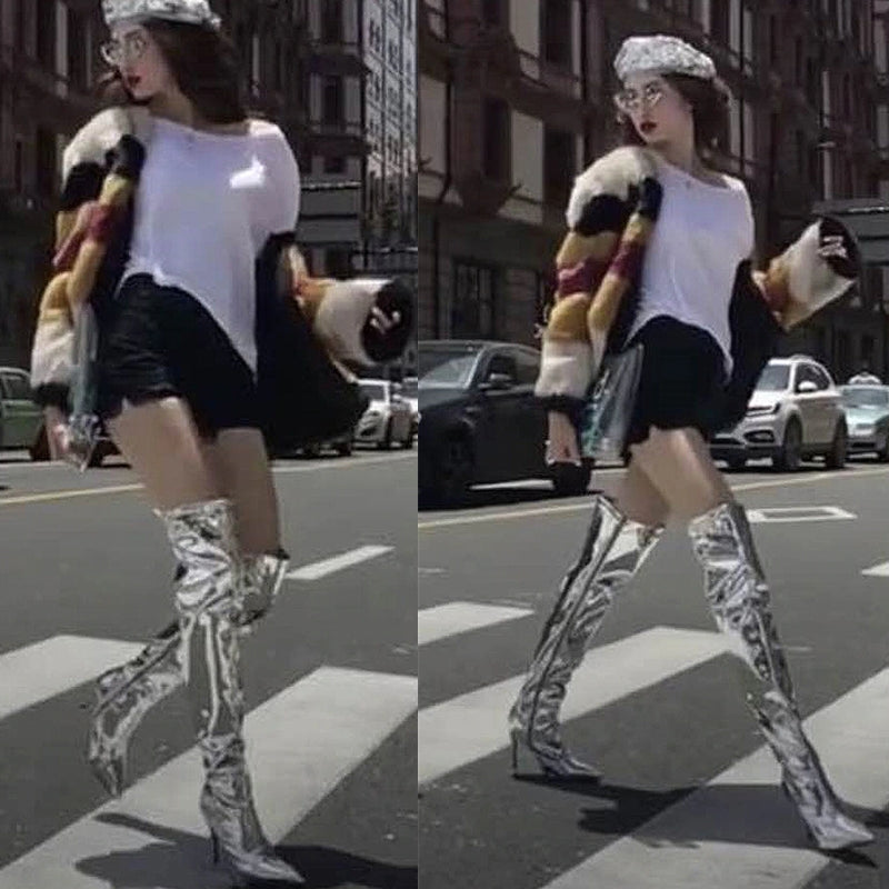 Women Boots Mirror Platform Pointy Toe High Thin 10cm Heels Over The Knee Long Boots Autumn Winter Zip Silver Casual Party Shoes