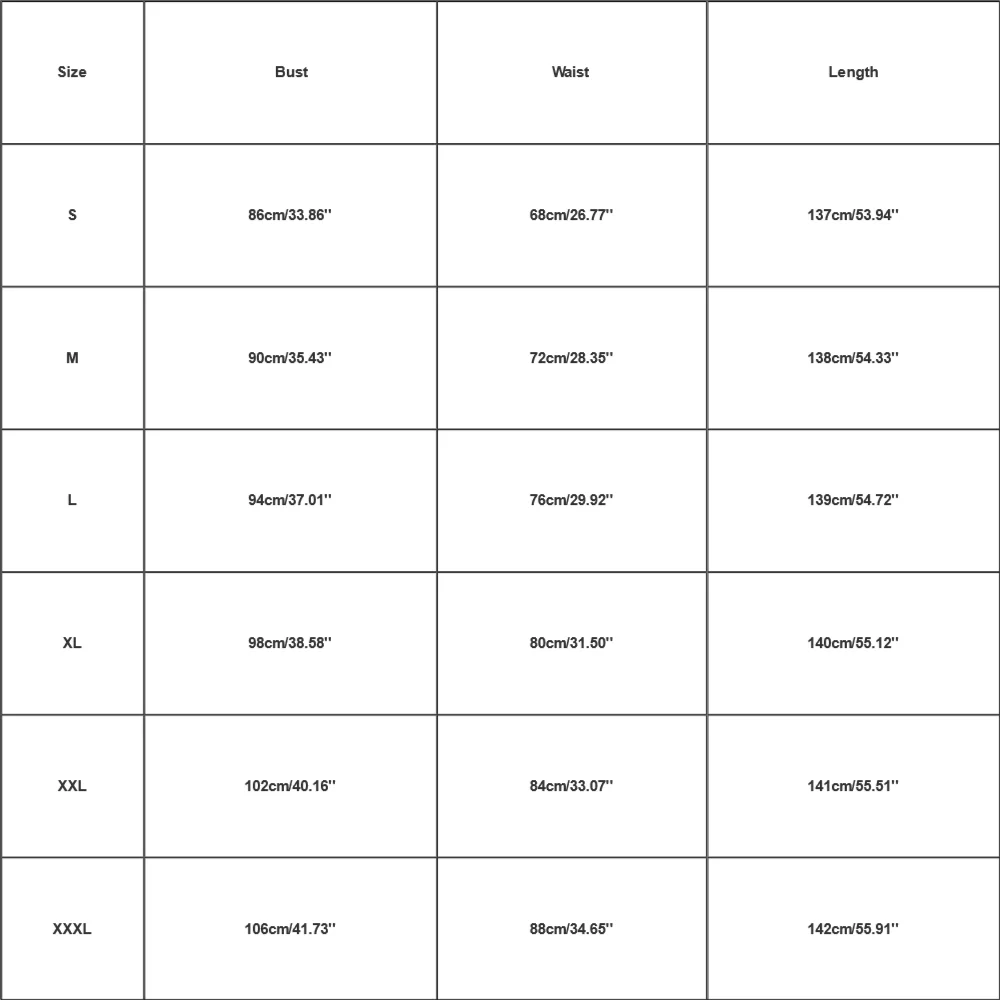 | Size:XL | Bust:98cm/38.58'' | Waist:80cm/31.50'' | Length:140cm/55.12'' |